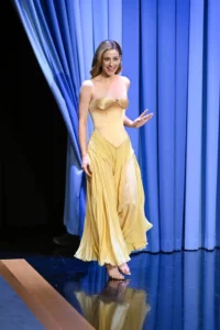 Reinhart’s appearance felt poised, calm, and fully in tune with the energy of a major talk show moment. Her styling kept the focus on the gown’s golden tones and the effortless flow of the skirt. It was a fresh, modern take on evening glamour, built for the mix of conversation, cameras, and live audience energy.